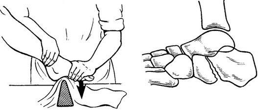 При осколкових переломах тіла п'яткової кістки, коли значно опускається подовжній звід, необхідно проводити вправляння на клині (рис. 72) під місцевою анестезією або наркозом. При накладенні гіпсової пов'язки ретельно моделюють подовжній звід.