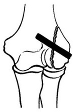 При вправленні внутрішнього виростка дотримується та ж техніка, але замість приведення передпліччя проводиться відведення. У випадках, коли закрите вправлення не увінчалося успіхом, а також при переломах виростків з поворотом фрагмента навколо осі, коли закрита репозиція неефективна, а також при несвіжих переломах (понад 5 днів) показана відкрита репозиція виростка. Суть операції полягає у вправленні і стягнення виростка, який фіксується до материнського ложу кетгутом або шовком у дітей і гвинтами, кістковими штифтами або металевими спицями у дорослих (рис. 38). Післяопераційна фіксація гіпсовою пов'язкою або задньою гіпсовою шиною протягом 3-4 тижнів.