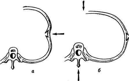 За механізмом травми розрізняють прямі переломи внаслідок сильного удару грудної клітки про виступаючий предмет і непрямі від здавлення грудної клітки (рис. 21).