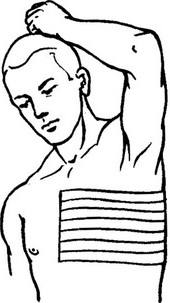 Рис. 22. Фіксація грудної клітки на стороні перелому ребер смугами липкого пластиру.