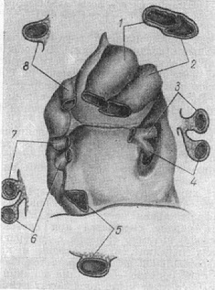![]() Рис. 2. Відмінності в топографо-анатомічні взаємовідносини перехідної складки перикарда на судинах кореня серця (цифрами позначені боку покриття перикардом судин): 1 - аорта; 2 - легеневий стовбур; 3 - ліва верхня легенева вена; 4 - ліва нижня легенева вена; 5 - нижня порожниста вена; 6 - ліва нижня легенева вена; 7 - права верхня легенева вена; 8 - верхня порожниста вена.  |