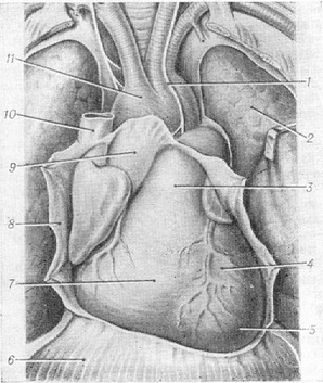 ![]() Рис. 3. Положення серця в порожнині перикарда (вигляд спереду): 1 - n. vagus sin.; 2 - pulmo sin.; 3 - a. pulmonalis; 4 - ventriculus sin.; 5 - apex cordis; 6 - diaphragma; 7 - ventriculus dext.; S - pericardium; 9 - aorta ascendens; 10 - v. cava sup.; 11 - arcus aortae.  |