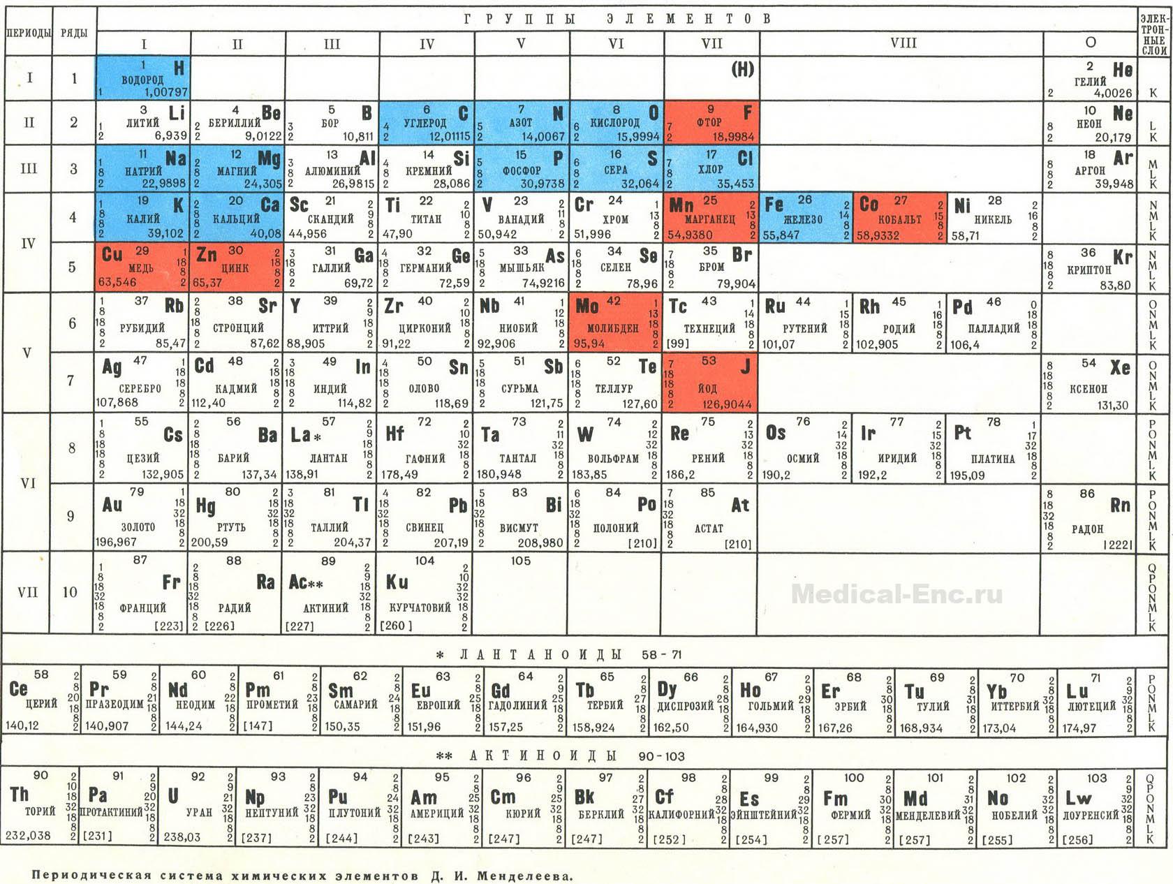 Деякі групи елементів мають особливі назви. Так, елементи головних підгруп I групи називають лужними металами, II групи - лужно-земельними металами, VII групи - галогенами, елементи, розташовані за ураном,- трансурановими. Елементи, які входять до складу організмів, беруть участь у процесах обміну речовин та мають явно вираженою біологічною роллю, називають біогенними елементами. Всі вони займають верхню частину таблиці Менделєєва Д. І.. Це в першу чергу Про, З, Н, N, Са, Р, К, S, Na, Cl, Mg і Fe, що складають основну масу живої речовини (більше 99%). Місця, зайняті цими елементами в П. с. х. е., пофарбовані в світло-блакитний колір. Біогенні елементи, яких в організмі дуже мало (від 10-3 до 10-14%), називають мікроелементами (див.). У клітинах П. с. х. е., забарвленого в жовтий колір, поміщені мікроелементи, життєво важливе значення яких для людини доведено.