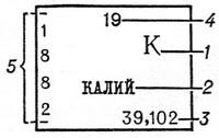 ![]() Умовні позначення до кольоровий таблиці: 1 - хімічний символ елемента; 2 - назва; 3 - атомна маса (атомна вага); 4 - порядковий номер; 5 - розподіл електронів по верствам.  |