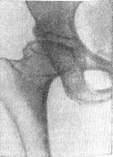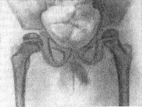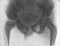 ![]() Рис. 2. Хвороба Пертеса, III стадія, той же Сольною, що і на рис. 1, через 1 рік і 4 місяці. Нерівномірне розрідження деформованого і ущільненого епіфіза головки лівої стегнової кістки - картина секвестроподобных тіней, потовщення голівки та шийки стегнової кістки, розширення рентгенівської суглобової щілини, підвивих стегнової кістки назовні. |