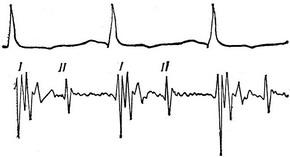 ![]() Фонокардиограмма (внизу) і електрокардіограма в третьому відведенні (вгорі) здорової людини: I і II - перший і другий тон. |