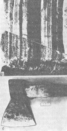 ![]() Рис. 83. Ідентифікація знаряддя. а - траси на кісткової тканини; б - ймовірне знаряддя. |