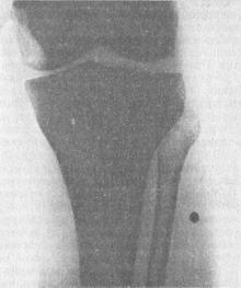 ![]() Рис. 84. Рентгенограма гомілки. Чужорідне тіло - картеч. |