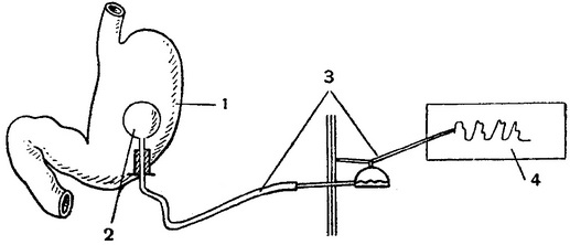 1 - шлунок; 2 - балончик, введений в шлунок; 3 - реєструючий пристрій; 4 - запис скорочень