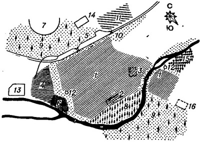 Рис. 1. Схема функціонального зонування території міста: 1 - сельбищна (житлова) територія; 2 - ділянка лікарні; 3 - ділянка вищого навчального закладу; 4 - промислова територія; 5 - смуга відводу залізниці; - територія річкового порту; 7 - територія аеропорту; 8 - територія міського парку; 9 - територія лісопарку; 10 - захисна зелена зона; 11 - територія складів; 12 - джерело водопостачання; 13 - очисні споруди каналізації; 14 - поля компостування; 15 - розплідник; 16 - кладовище.