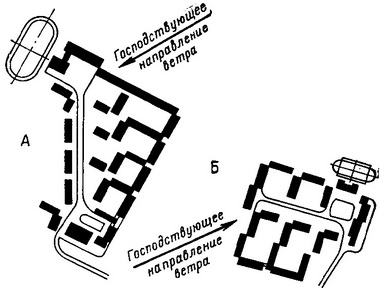 Особливо важливо враховувати кліматичні фактори при забудові мікрорайонів. Так, для населених місць Крайньої Півночі з його сильними вітрами і вкрай низькою температурою повітря, що несприятливо впливають на умовах життя населення, передбачають спеціальні прийоми забудови мікрорайонів та окремих житлових комплексів (рис. 2) з укритими вулицями-галереями, що зв'язують житлові будівлі з закладами обслуговування. У районах з жарким кліматом необхідно передбачати захист населення від перегріву - максимальне затінення пішохідних доріжок і тротуарів, гарне провітрювання території мікрорайонів і звернення їх у бік озеленених площ і водних поверхонь, озеленення вільної території в поєднанні з зволоженням покриттів і т. д. Житлові приміщення та приміщення дитячих і лікувальних закладів у районах з жарким кліматом не можна орієнтувати на південний захід і захід; слід широко застосовувати сонцезахисні пристрої. У районах, де захист від перегріву не є обов'язковою вимогою, при визначенні величини розривів між будівлями і орієнтації будинків керуються «Санітарними нормами і правилами забезпечення інсоляції житлових та громадських будинків та жилої забудови населених місць» (№ 427-63).