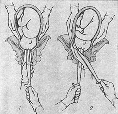 ![]() Рис. 2. Накладення краниокласта на передлежачої головки: 1 - введення«внутрішньої» бранші, фіксація головки (перший момент); 2 - введення «зовнішньої» бранші, тиск на голівку ослаблене (другий момент). |
