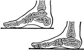 ![]() Рис. 2. Взаємовідношення кісток стопи в нормі (вгорі) і при поздовжньому плоскостопості (внизу).  |