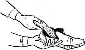 Починають гімнастику з ходьби босоніж з упором на всю стопу, потім ходьба навшпиньках, присідання і ходьба на зовнішньому краї стопи. Завершують вправи підскоками і стрибками на пальцях (рис. 5). Проводять вправи з витягуванням шкарпеток ніг з упором пальцями в нерухомий предмет, згинання пальців стопи, притиснутою до підлоги, захоплення та піднімання пальцями дрібних предметів з підлоги. Рекомендується ходьба босоніж по нерівній землі, піску, лазіння по гладкому жердини, біг, стрибки, гра у футбол. У взуття вкладають спеціальну чіп - супінатор (рис. 6), яка піднімає опущену подовжній звід. Поперечний звід вдається підняти, подклеив до устілки, відповідно голівок II-III плеснових кісток, смужку м'якої гуми довжиною 2,5 см, шириною 2 см і товщиною (в середній частині) 0,8 см. При вираженому плоскостопості рекомендується спеціальне ортопедичне взуття (див.). У важких випадках плоскостопості зі стійкою деформацією стопи, особливо при травматичному плоскостопості, проводять операції на зв'язках і кістках стопи.
