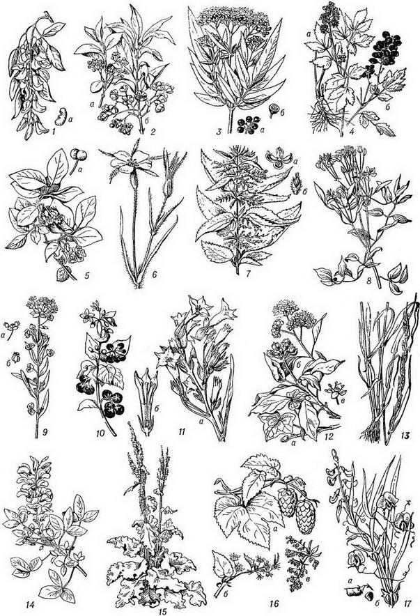 Рис. 1. Біла акація (суцвіття): а - насіння. Рис. 2. Бересклет європейський: а - гілка з квітками; б - гілка з плодами. Рис. 3. Бузина смердюча: а - плоди (ягоди); б - ягода в поперечному розрізі. Рис. 4. Воронець колосистий: а - верхня частина квітучої рослини; б-верхня частина рослини з плодами. Рис. 5. Жимолость звичайна: а - плоди (ягоди). Рис. 6. Кукіль посівної. Рис. 7. Кропива дводомна: про - тичинкові квітка; б - маточкова квітка. Рис. 8. Ломиніс прямий. Рис. 9. Молочай прутьевидный: а - частина суцвіття; б - маточкова квітка. Рис. 10. Паслін чорний. Рис. 11. Тютюн віргінський: а - верхня частина квітучої рослини; б - квітка у поздовжньому розрізі. Рис. 12. Плющ звичайний: а - вегетативний втечу; б - генеративні пагони (з квітками і плодами); в - квітка. Рис. 13. Плевел п'янкий. Рис. 14. Ракитник бобовниковый. Рис. 15. Ревінь городній. Рис. 16. Хміль звичайний: а - частина пагона з плодами; б - втеча з маточковими квітками; в - втеча з тичинковими квітками. Рис. 17. Чина посівна: а - плід (боб); б - насіння.