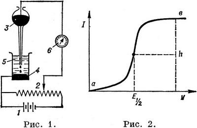 Схема найпростішого полярографа дана на рис. 1. Від потенціометра 2, з'єднаного з акумулятором 1, подають поступово зростаюча напруга на поляризующийся, зазвичай ртутний краплинний електрод 3 і неполяризующийся електрод 4 - шар ртуті з відносно великою поверхнею. Величину струму, що проходить через аналізований розчин 5, вимірюють гальванометром 6. При визначенні відновлюючих речовин поляризующийся електрод з'єднують із негативним полюсом джерела струму, при визначенні окислюються речовин - з позитивним полюсом. На підставі отриманих даних викреслюють полярограмму. У авторегистрирующих полярографах крива викреслюється автоматично. При наявності в розчині одного визначуваної речовини полярограмма має вигляд, показаний на рис. 2. Криву ab називають полярографічною хвилею. Висота h цієї хвилі пропорційна концентрації аналізованого речовини в розчині. Напруга E1/2, відповідне половині висоти хвилі і називається потенціалом півхвилі, залежить від природи аналізованого речовини. Якщо у розчині міститься кілька речовин, здатних відновлюватися або окислюватись на поляризующемся електроді, полярограмма складається з декількох хвиль. При цьому природа кожної речовини визначається за величинами Е1/2, а їх концентрації в розчині - по висотах h відповідних хвиль.