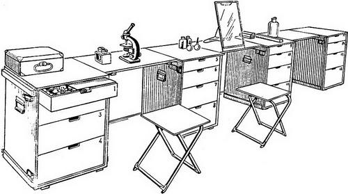 Діагностичні, лікувальні апарати і прилади поміщаються в укладальних ящиках і представлені в основному модифікаціями відповідних приладів мирного часу (польовий фізіотерапевтичний кабінет, польовий рентгенівський кабінет і ін). Польові лабораторні та аптечні комплекти розміщуються в укладках, пристрій яких дозволяє розгорнути робоче місце без додаткової меблів (рис. 3).