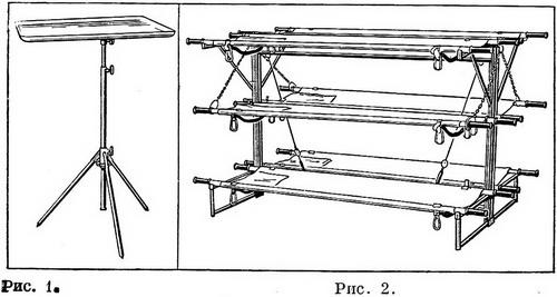 Польове обладнання етапів медичної евакуації відрізняється портативністю в складеному вигляді, легкістю і міцністю. До нього відносяться: столи перев'язувальні та операційно-перев'язочні; універсальна металева стійка-тринога, яка разом з предметами-насадками утворює інструментальний столик для хірургічних інструментів і перев'язувального матеріалу (рис. 2) або флаконодержатель для фіксації судин (ампул і флаконів) з кров'ю і кровезамінюючими рідинами, або умивальник з ліктьовим краном, або утримувач двох тазиків для обробки рук хірурга по способу Спасокукоцька - Кочергіна, або столик для перев'язки кінцівок і ін; складні підставки під ноші (див.), 3 - і 6-місцеві триярусні верстати К. Н. Павловського (рис. 3), лікування представлені в основному польовими модифікаціями відповідних приладів, призначених для мирного часу (польовий фізіотерапевтичний кабінет, польовий рентгенівський кабінет і ін). Всі вони вміщуються в укладальних ящиках. Для мед. розвідки і діагностики використовуються набори, що включають заборникі проб і найпростіші індикатори, а також польові лабораторні комплекти в спеціальних укладках, що дозволяють розгорнути робоче місце без додаткової меблів (рис. 4).