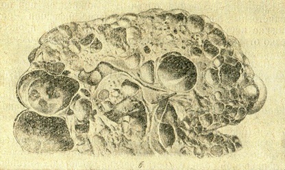 Полікістозних нирки у більшості випадків збільшені в розмірах, поверхня їх горбиста. На розрізі видно безліч порожнин, тонкі прошарки паренхіми, здавлені і витягнуті в довжину миски та чашечки (рис. 57).
