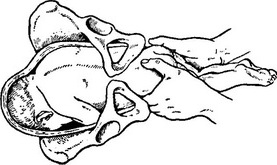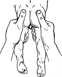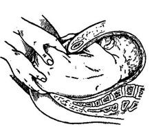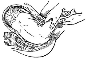 3. За звільнення другий ніжки обидві ніжки захоплюються так, щоб чотири пальці кожної руки акушера лягли на передню поверхню стегон, а великі пальці - на крижі плода (обережно з тиском пальців на животик плоду! У новонароджених відносно велика печінка, і її легко можна травмувати). Тракції виробляються на себе, з деяким нахилом донизу доти, поки в статевої щілини не здасться нижній кут лопаток плода. На рис. 13, 14, 15 і 16 схематично показані деякі етапи цієї операції.