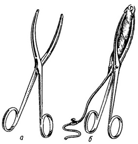 ![]() Рис. 9. Інструментарій для операцій кольпейриза. а - щипці для закладу кольпейринтера; б - кольпейринтер в щипцях. |