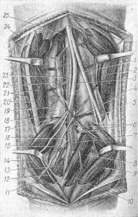 Рис. 2. Топографія підколінної ямки: 1 - n. peroneus communis, 2 - m, biceps femoris; 3 - n. tibialis; 4 - a. genus superior lat.; 5 - n. cutaneus surae lat,; 6 - aa. genus mediae; 7 - a. genus inf. lat ; 8 - m, plantaris; 9 - caput lat. m. gastrocnemii; 10 - m. soleus; 11 - v. sapliena parva; 12 - n. cutaneus surae med.; 13 - m. popliteus; 14 - caput med. m. gastrocnemii; IS - a. genus inf. med.; 16 - lig, popliteum obliquum; 17 - a. genus, sup. med.; 18 - fades poplitea femoris; 19 - tendo m. abductoris magni; 20 - tendo m. semitendinosi; 21 - m. semimembranosus; 22 - m vastus med.; 23 - a. et v. poplitea; 24 - ramus anastomoticus v. saphenae parvae et v. saphenae magnae; 25 - m adductor magnus.