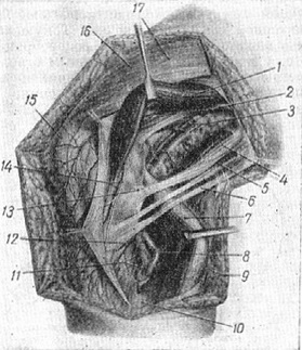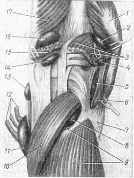 Рис. 3. Топографія судин і нервів у внутрішньому відділі підколінної ямки: 1 - m. sartorius; 2 - m. adductor magnus; 3 - а. et v. poplitea, 4 - m. semimembranosus; 5 - m. gracilis; 6 - tendo m. semitendinosi; 7 - caput med. m. gastrocnemii; 8 - n. tibialis, 9 - v. saphena magna et ramus cutaneus ant. (media) is) n. (emoralis; 10 - m. soleus; 11 - vasa tibialia post., 12 - a. genus inf. medialis; 13 - bursa m. semimembranosi; 14 - a genus et descendens n. saphenus; 15 - patella, 16 - fascia m. vasti med.; 17 - ramus cutaneus ant. (ramus infrapatellaris) n. femoralis.