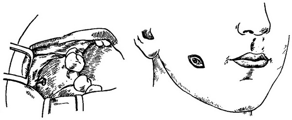 Рис. 51. Підборідний свищ в результаті хронічного періодонтиту нижнього центрального різця.