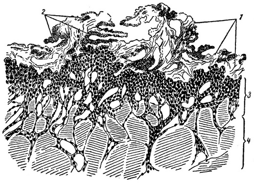 1 і 2 - обривки некротизованої децидуальної оболонки зі скупченням в них мікробів; 3 - грануляционный вал (скупчення лейкоцитів); 4 - м'язовий шар матки.