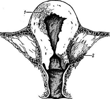 Рис. 112. Поширення патогенних мікробів по лімфатичних шляхах. 1 - проникнення мікробів із плацентарної площадки через м'язовий шар до очеревини; 2 - розповсюдження мікробів в параметральну клітковину.