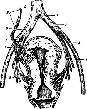 Рис. 113. Поширення патогенних мікробів з венозним судинам при септичному післяпологовому захворюванні. 1 - утворення тромбу в місці розгалуження порожнистої вени; 2-8 - vena iliaca communis; 3-7 - v. hypogastrica; 4 - v. femoralis; 5 - v. uterina; 6 - плацентарна площадка; 9 - v. spermatica; 10 - v. cava. |
