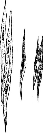 ![]() Рис. 115. М'язові волокна матки з білковим помутнінням і жировим переродженням (з 6 по 18-й день післяпологового періоду). |