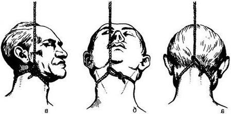 Вузол петлі по відношенню до шиї може розташовуватися або ззаду - типове розташування петлі, що зустрічається найбільш часто, або на передній або бічних поверхнях шиї - атипове розташування петлі (рис. 7). Як правило, петля на шиї має косо-висхідний (у бік вузла петлі) напрямок, що відбивається на особливостях генезу смерті при повішенні.