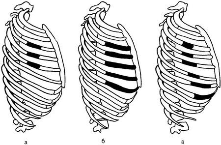 При ударах тупим твердим предметом з відносно невеликою пошкоджує поверхнею ребра ламаються в місці прикладання сили. У випадках здавлення предметом із широкою поверхнею локалізація переломів виявляється неоднаковою у різних суб'єктів і залежить від форми грудної клітки (рис. 31). Стійкість по відношенню до зовнішнього впливу при інших рівних умовах у грудних клітин різної конфігурації неоднакова: для плоскої, конічної форми грудної клітки вона становить 1700-2000 М, для циліндричної - 3000-3500 М.