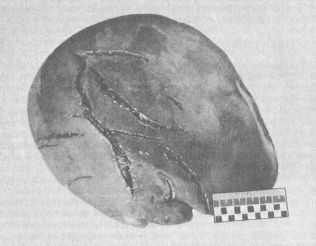 Внутрішні органи. При травмі тупими предметами виникли пошкодження не завжди повністю відображають характер і силу зовнішнього впливу на тіло людини. Внутрішні органи можуть травмуватися значною мірою внаслідок удару і струсу. Поширення ударної хвилі по паренхиматозному органу (селезінка, печінка, нирки) викликає розтріскування капсули і розрив тканини. Виникають пошкодження щілиноподібної зигзагоподібної форми, розташовані паралельно один одному і завжди поперечно по відношенню до напрямку ударної хвилі (рис. 33).