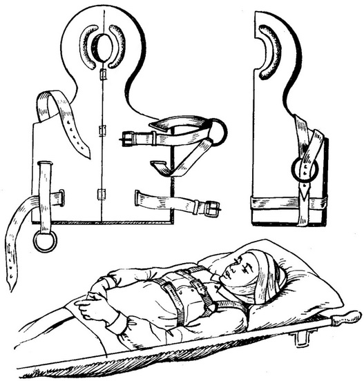 При пошкодженнях черепа має значення ступінь набухання, набряку мозку та порушення регулюючих функцій кори великих півкуль, внаслідок чого можуть настати розлад дихання, порушення діяльності серцево-судинної системи, паралічі і парези кінцівок. Хворих з черепно-мозковими травмами транспортують, як правило, машиною швидкої допомоги. Найбільш щадний вид транспортування - це перенесення хворого на ношах, повільна, без трясіння. Порівняно непогано переносять хворі транспортування водним і повітряним транспортом. Під час транспортування голова потерпілого повинна бути фіксована спеціальної шиною Єланського (рис. 20).