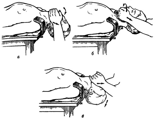 Техніка одномоментного вправляння (А. В. Каплан). Хворому за півгодини до вправляння вводять 1 мл 1% розчину пантопону або морфіну. Наркозу і навіть місцевого знеболювання треба уникати, так як при цьому можливе застосування різких маніпуляцій, які тут особливо неприпустимі. Хворого в положенні на спині укладають так, щоб голова звисала на край столу. Для додаткового витягування за голову можна використовувати глиссонову петлю. Прив'язаний до неї шнур закріплюють за пояс хірурга. Помічник двома руками, накладеними на обидва надпліччя хворого, утримує їх і створює Противовытяжение. Хірург одну поміщає долоню на потилицю хворого і підтримує його голову, а іншу долоню кладе під підборіддя (рис. 49). За допомогою гліссонової петлі, одягненою на голову хворого, хірург, до пояса якого прикріплений шнур від петлі, відхиляючись назад, виробляє плавно, без ривків, витягування в напрямку осі відхиленої голови і шиї. Після не менше 5 хв хірург, продовжуючи витягування, руками, накладеними на голову хворого, повільно відхиляє її в протилежну від пошкодження бік. Далі, також без всякого насильства, хірург плавно повертає голову хворого таким чином, щоб підборіддя повернувся до серединної лінії. Після цього продовжують витягування за голову і шия переразгибается. У цьому положенні роблять контрольну рентгенограму. Переконавшись, що підвивих усунутий, накладають на 3-4 тижнів нашийник з ватно-марлевою подушки, а поверх нього 1-2 гіпсового бинта.