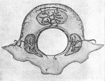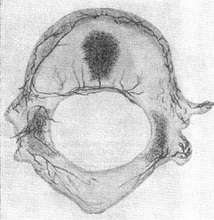 ![]() Рис. 2. Ядра окостеніння і судини хребця плода 3,5 міс. (рис. з просвітленого препарату; X15). |
