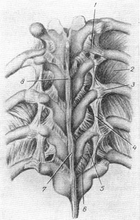 Венозні сплетення хребта, складаючи єдине ціле, простягаються від основи черепа (тут вони пов'язані з потиличним венозним синусом) до куприка. Ця венозна система, широко анастомозирующая з околопозвоночными венами,- важлива комунікація між нижньою та верхньою порожнистими венами. Як вважають, це коллатеральный шлях має велике значення в підтримці функціонального рівноваги між системами верхньої та нижньої порожнистих вен. Відсутність у венах хребта клапанів обумовлює можливість просування крові в будь-якому напрямку. Ця функціональна особливість хребетних вен, на думку ряду авторів, пояснює їх роль в поширенні інфекції та метастазів у П.