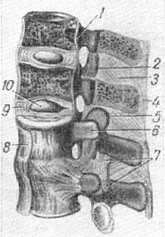 ![]() Рис. 9. Поперековий відділ хребта: 1 - lig. longitud. post.; 2 - lig. flavum; з - lig. interspinale; 4 - lig. supraspinale; 5 - proc. artic. sup.; 6 - proc. transversus. 7 - lig. inter-transversarium; 8 - lig. longitud. ant.; 9 - anulus tibrosus; 10 - nucl. pulposus. |