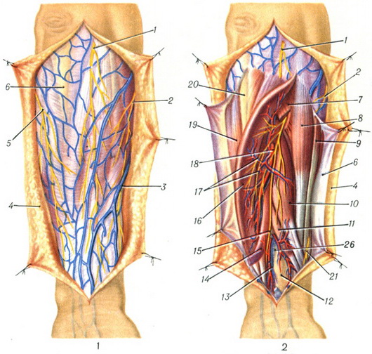 Рис. 1-4. Судини і нерви переднього відділу передпліччя. Рис. 1. Поверхневі шкірні вени і нерви. Рис. 2. Поверхнево розташовані м'язи, судини і нерви (фасція передпліччя частково видалена і відвернута). Рис. 3. Глибокі м'язи, судини і нерви (поверхневі м'язи частково видалені). Рис. 4. Поділ плечової артерії, відходження загальної міжкісткової артерії, серединний нерв (на всьому його протязі), глибокі м'язи, судини і нерви (поверхневі м'язи видалені; m. pronator teres розсічений і відвернуть). 1 - v. собор; 2 - ramus ant. n. cutanei antebrachii med.; 3 - v. cephalica; 4 - n. cutaneus antebrachii lat.; 5 - шкіра з підшкірною жировою клітковиною; 6 - fascia antebrachii; 7 - v. mediana cubiti; 8 - m. pronator teres; 9 - m. flexor carpi radialis; 10 - m. palmaris longus; 11 - m. flexor carpi ulnaris; 12 - n. ulnaris; 13 - a. et vv. ulnares; 14 - m. flexor digitorum superficialis; 15 - n. medianus; 16 - a. et vv. radiales; 17 - ramus superficialis n. radialis; 18 - m. brachioradialis; 19 - m. pronator quadratus; 20 - m. flexor pollicis longus; 21 - m. flexor digitorum profundus; 22 - a. et vv. interosseae ant.; 23 - n. interosseus ant.; 24 - a. interossea communis; 25 - ramus profundus n. radialis; 26 - a. brachialis.