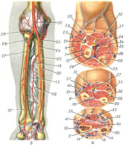 Рис. 1-4. Судини і нерви передпліччя. Рис. 1. Поверхневі вени та нерви. Рис. 2. Глибокі судини і нерви. Рис. 3. Артерії передпліччя (полусхематично). Рис. 4. Поперечні розпили правого передпліччя на рівні проксимальної, середньої та дистальної третини. 1 - n. cutaneus antebrachii post.; 2 - n. cutaneus antebrachii lat.; 3 - v. cephalica; 4 - шкіра з підшкірною жировою клітковиною; 5 - ramus ulnaris n. cutanei antebrachii med.; 6 - fascia antebrachii; 7 - m. supinator; 8 - m. extensor carpi radialis brevis; 9 - m. extensor carpi radialis longus; 10 - m. abductor pollicis longus; 11 - m. extensor pollicis brevis; 12-radius; 13 - a. inlerossea ant. (et v. interossea ant.); 14 - m. extensor pollicis longus (обрізаний); 15 - n. interosseus post.; 16 - m. extensor digitorum; 17 - rami musculares; 18 - a. Interossea post, (et v. interossea post.); 19 - m. extensor carpi ulnaris; 20 - ulna; 21 - ramus superficialis n. radialis; 22 - a. brachialis; 23 - a. recurrens ulnaris; 24 - a. ulnaris (et w. ulnares на распилах); 25 - a. Interossea communis; 26 - membrana Interossea; 27 - a. radialis (et vv. radiales на распилах); 28 - tendo musculi bicipitis brachii (отвернуто); 29 - a. recurrens radialis; 30 - m. pronator teres; 31 - m. flexor carpi radialis; 32 - m. palmaris longus; 33 - m. flexor digitorum superficialis; 34 - m. flexor carpi ulnaris; 35 - n. ulnaris; 36 - m. flexor digitorum prof.; 37 - n. medianus; 38 - m. brachioradialis; 39 - ramus dorsalis manus n. ulnaris; 40 - m. pronator quadratus; 41 - m. flexor pollicis longus.
