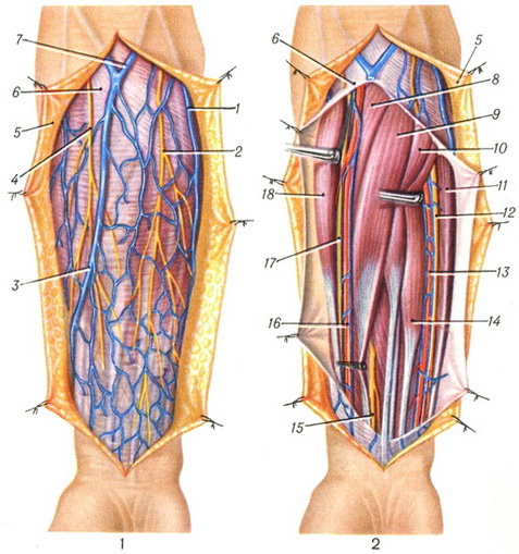 Венозний відтік відбувається через підшкірні і глибокі вени.