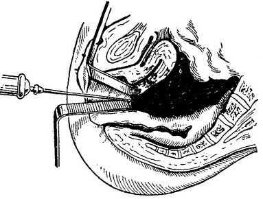 У піхву вводять жолобувате дзеркало і підйомник, задню губу шийки захоплюють двома парами кульових щипців. В задній звід, відступивши на 1-2 см від задньої губи шийки матки, точно по середній лінії роблять вкол голки на глибину 3-4 див Потім шприцом насасывают кров, що накопичилася в малому тазу. Не слід робити вкол в бічні склепіння з-за небезпеки поранити великий посудину або сечовід (мал. 47).