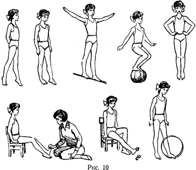 Наводимо ряд вправ, рекомендованих для профілактики і лікування плоскостопості у дітей дошкільного та шкільного віку (рис. 10): ходьба на носках, ходьба на зовнішньому краї стоп, ходьба на палиці, «присідання» на м'ячі, підскоки на носках, рухи ніг з опором, що чиниться дорослим, збирання дрібних предметів і катання обруча пальцями ніг.