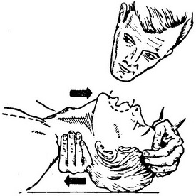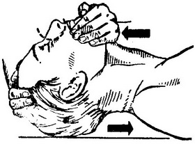 За способом «рот в ніс» однією рукою відтягують голову потерпілого назад, а інший за нижню щелепу стискають рот і його губи і, роблячи глибокі вдихи, вдихають повітря в ніс потерпілого (рис. 14).