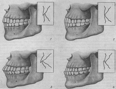 Рис. 1. Типи нормальних прикусів: 1 - ортогнатия; 2 - ортогения, 3 - бипрогнатия, 4 - прогения (нижня прогнатия).