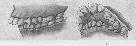 Прогнатия обумовлена недорозвиненням нижньої або надмірним розвитком верхньої щелепи. Верхня щелепа нерідко настільки виступає вперед, що нижні передні зуби не стосуються верхніх і між ними залишається значний проміжок (рис. 2). Така форма прогнатии часто ускладнюється глибокою резцовым перекриттям, в результаті чого нижні передні зуби висуваються і травмують своїми ріжучими краями слизову оболонку піднебіння. Такий патологічний прикус несприятливо відбивається на зовнішньому вигляді пацієнта, на жуванні і дикції.
