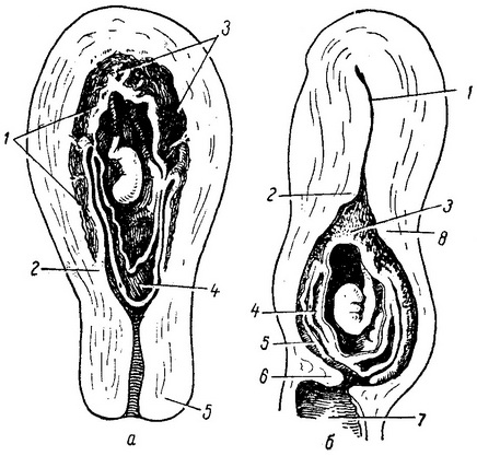 а - викидень на другому місяці вагітності (за Бумму). Перша стадія: 1 - d. vera, 2 - розкривається внутрішній зів, 3 - d. serotina, 4 - d. reflexa, 5 - зовнішній зів; б - викидень на 2-му місяці вагітності. Друга стадія (шийковий аборт): 1 - порожнина матки, 2,8 - внутрішній зів, 3 - d. serotina, 4 - d. capsularis, 5 - d. vera, 6 - зовнішній зів, 7 - піхва.