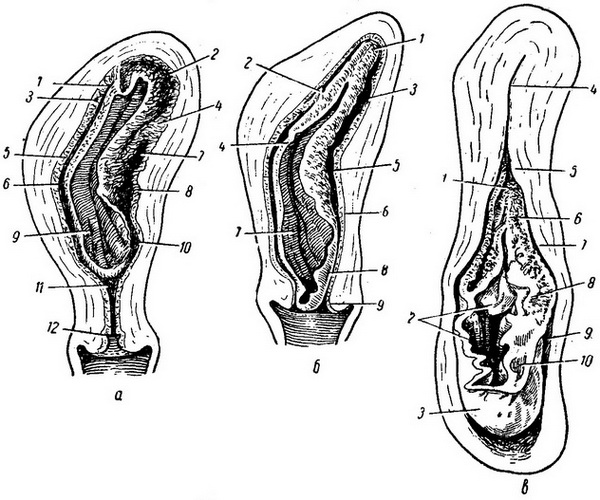 а - викидень на третьому місяці вагітності (за Бумму). Перша стадія. Почалися відшарування плаценти і розкриття шийки; 1 - перехідна складка d. capsularis; 2 - місце міцного з'єднання плаценти зі стінкою матки; 3,5 - пристінкові оболонка; 4 - місце почалася відшарування плаценти; 6 - d. capsularis; 7,8 - місце відшарування; 9 - яйцевая порожнину (без плоду); 10 - внутрішній зів; 11 - розширена верхня частина шийкового каналу; 12 - зовнішній зів; б - викидень на третьому місяці вагітності (за Бумму). Друга стадія. Відшарування плаценти за винятком однієї ділянки - трубного кута закінчена, почалася відшарування пристінною оболонки (d. vera), шийка розширена і містить полюс яйцевого мішка; 1 - неотслоившийся ділянку плаценти; 2 - перехідна складка між пристінною і капсулярної оболонками; 3,5 - відшарувалися плаценти; 4 - d. capsularis; 6 - внутрішній зів; 7 - яйцевая порожнину (без плоду); 8 - капсулярних оболонка; 9 - зовнішній зів; - викидень на третьому місяці вагітності (за Бумму). Третя стадія. Изгнанное з матки яйце лежить в шийці і піхвовому склепінні і тягне за собою пристеночную оболонку; 1-й. vera; 2 - порожнина яйця; 3 - нижній полюс яйця; 4 - порожнина тіла матки; 5 - внутрішній зів; 6 - формується плацента; 7 - зовнішній зів; 8 - плацента; 9 - піхвовий звід; 10 - стінка плодового мішка, просочена кров'ю.